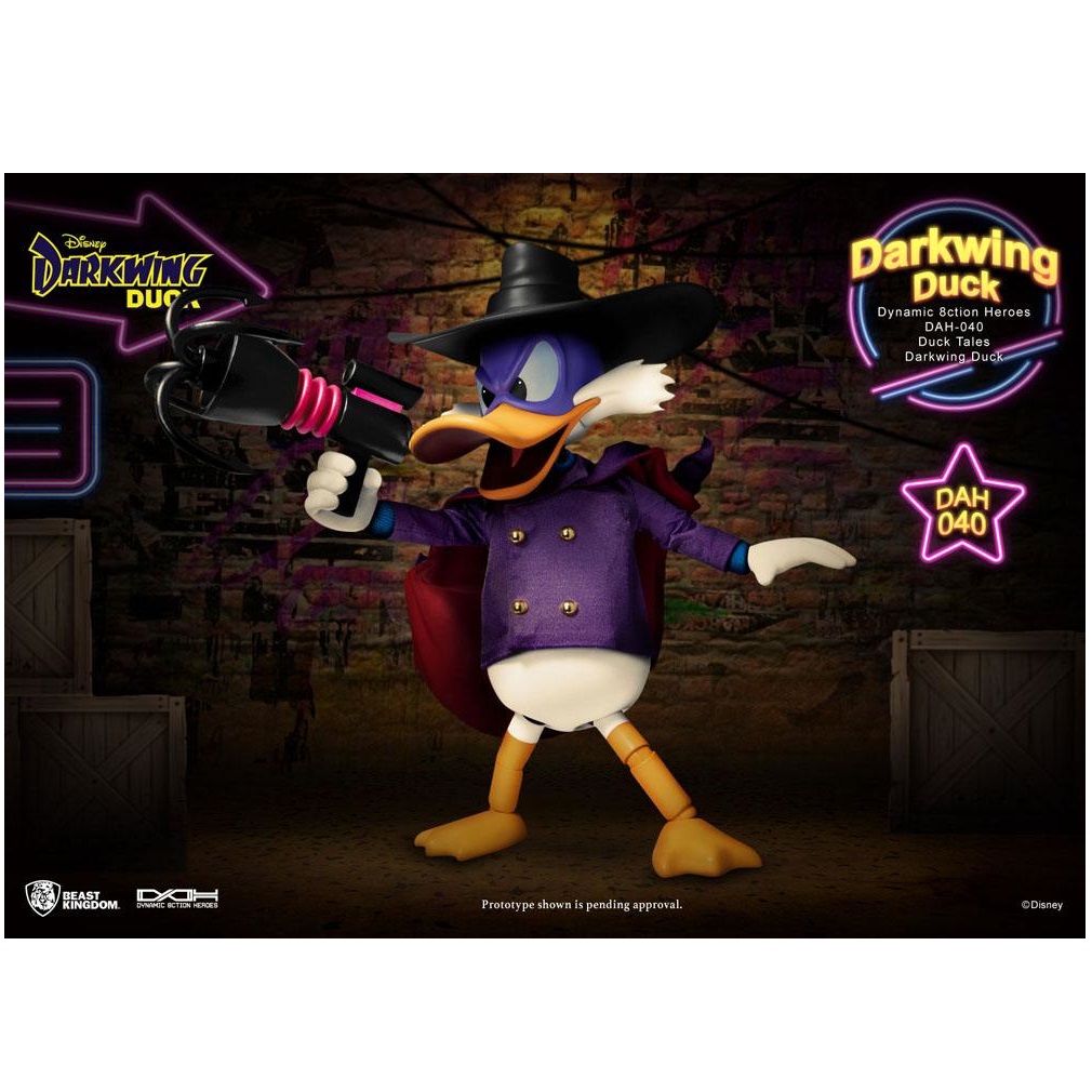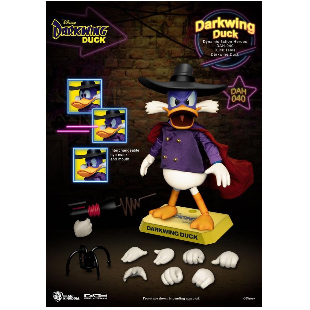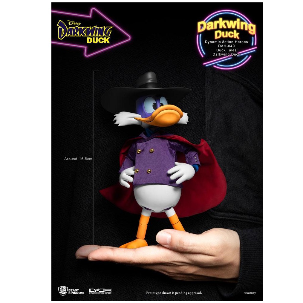 Darkwing Duck della Disney è tornato ancora una volta nella cultura popolare, con un nuovo riavvio animato della Disney. Il classico spettacolo degli anni ’90 ci ha fatto conoscere un detective diverso da qualsiasi altro. In parte combattente del crimine, in parte detective, il nostro supereroe titolare è a un passo dalla risoluzione di un crimine vicino a te! Aiutato dai suoi amici e da una serie di gadget e aggeggi, Darkwing Duck era tanto comico quanto eroico. “Entertainment Experience Brand” di Beast Kingdom mette in mostra il meglio del design DAH (Dynamic 8ction Hero). Altamente articolabile è pronta a saltare e saltare attraverso gli edifici in un colpo solo. Viene fornito con un completo di stoffa ed è equipaggiato con il suo rampino preferito. Sono inclusi anche numerosi accessori intercambiabili come l’espressione del viso, le mani e il supporto di base. Quindi assicurati di dare una casa a questo astuto papero detective e guardalo mentre risolve alcuni dei suoi misteri! Accessori: – Tre (3) maschere per gli occhi di ricambio (occhio normale/arrabbiato/grande e piccolo) – Due (2) bocchini di ricambio (apri/chiudi) – Cappello Anatra Ala Oscura – Sei (6) paia di lancette sostitutive – Pistola rampino – Tuta da detective viola in vero tessuto – Base per figura speciale con marchio e staffa