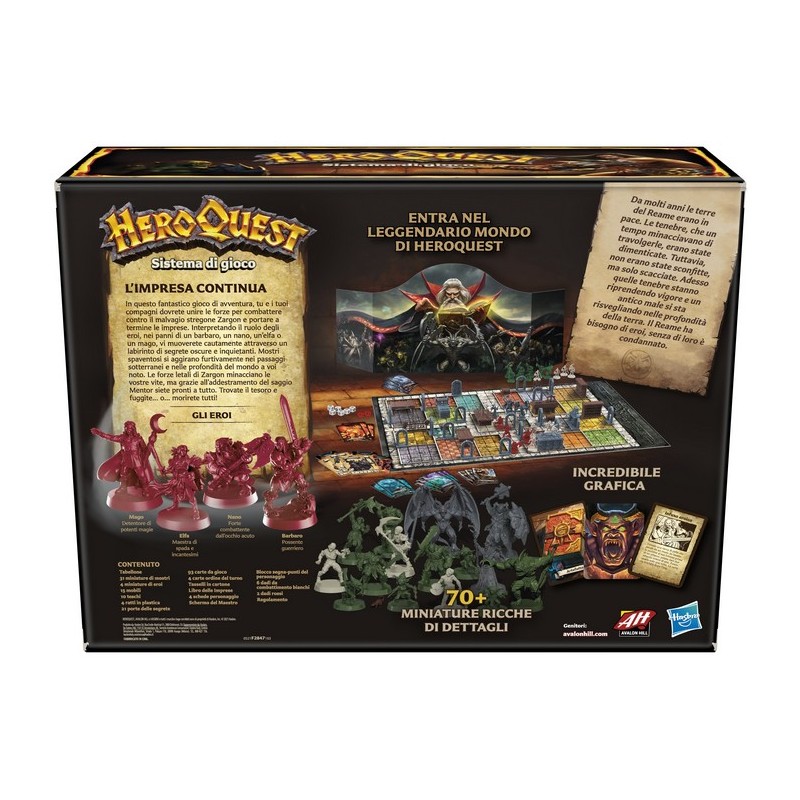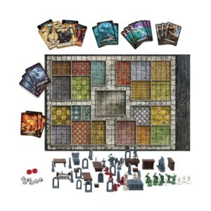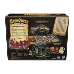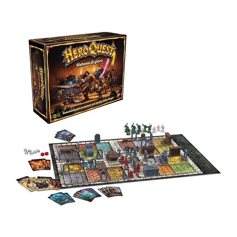 Ogni partita costituisce un'”Impresa”, ossia una missione con un obiettivo da portare a termine. I dungeon nascondono tesori, trappole, passaggi segreti e soprattutto mostri! Questi ultimi sono gestiti da un giocatore che riveste il ruolo di master, come nei giochi di ruolo. Contenuto: tabellone di gioco, schermo del master, 4 miniature degli eroi, 4 carte degli eroi, 31 miniature di mostri, 10 teschi, 4 ratti di plastica,ย 21 porte delle segrete,ย 15 elementi dello scenario,ย 93 carte da gioco,ย 4 carte di ordine del turno, segnalini in cartone, 6 dadi da combattimento bianchi,ย 2 dadi rossi,ย blocco di schede-personaggio,ย libro delle Imprese/missioni, regolamento. HeroQuest รจ adatto dai 14 anni in su e a ogni partita possono partecipare da 2 a 5 giocatori.