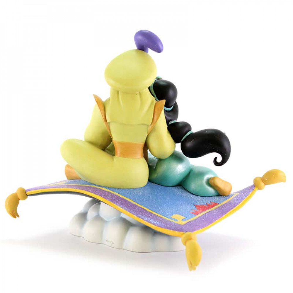 Stupenda raffigurazione di Aladino e Jasmine sul tappeto volante. Realizzata in resina dipinta a mano, collezione Walt Disney, linea Haute Couture.